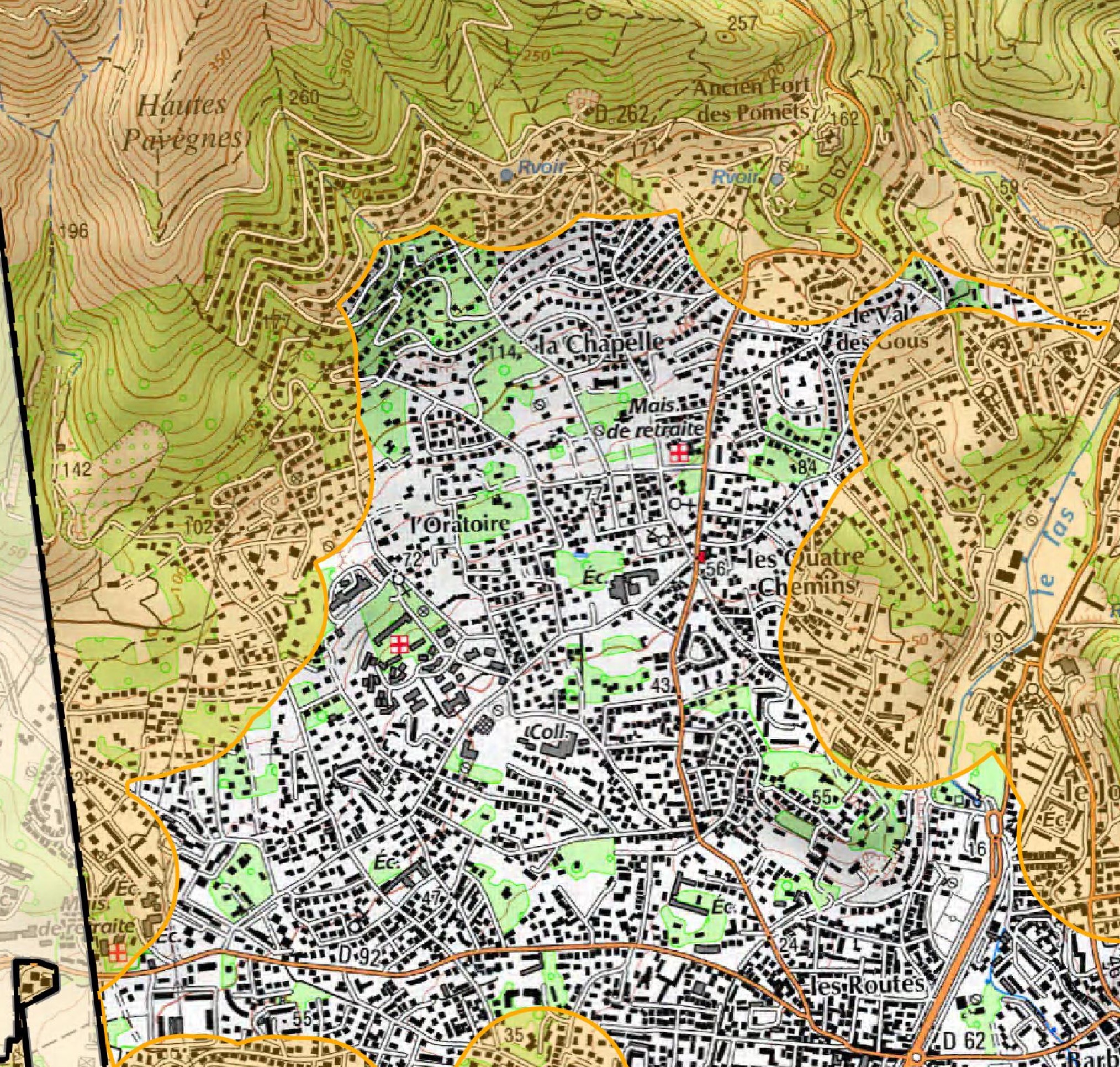 La zone d’application de la réglementation D.F.C.I. est celle qui apparait en coloré jaune-orangé. Le débroussaillage est obligatoire dans cette…